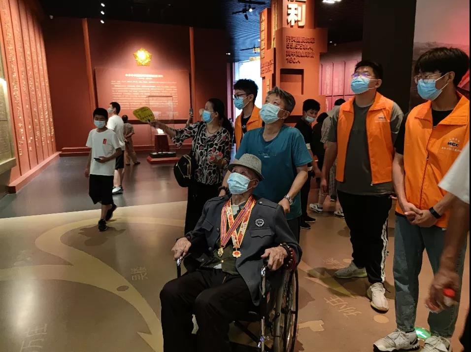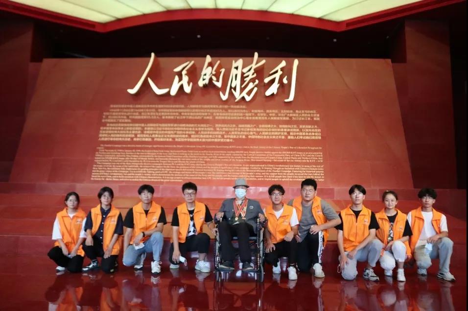 团队成员在淮海战役纪念馆中进行志愿讲解服务期间,接待了一位特殊的老人,老人年事已高,行动不便,身着绿军装,乘着轮椅,胸前挂着两枚金光闪闪的纪念章,在家人的陪同下来到了纪念馆。团队成员全程志愿服务和讲解,在参观过程中与老人家属交流得知,老人名叫张华义,江苏徐州人,96岁高龄,1945年参加中国人民解放军,并经历了淮海战役,抗美援朝战役等重大战役,荣获战时二等功,被授予“中华人民共和国成立70周年”纪念章,“中国人民志愿军抗美援朝出国作战70周年”纪念章,是当之无愧的人民英雄。作为淮海战役的亲历者,老人虽是耄耋之年,但他仍没有忘记当年的峥嵘岁月,坚持亲自来到淮海战役纪念馆参观,去追寻属于自己的红色记忆。在老人历经沧桑但仍坚毅的目光中,团队成员感受到前辈们的奉献精神,担当精神。实践队员表示“作为新时代大学生,正处于青春年少,朝气蓬勃的阶段,心中满怀梦想,更应在前辈走过的道路上,用青春激情努力拼搏,开拓创新,爱岗敬业,用青春和汗水为祖国的繁荣昌盛添上色彩斑斓的一笔。”