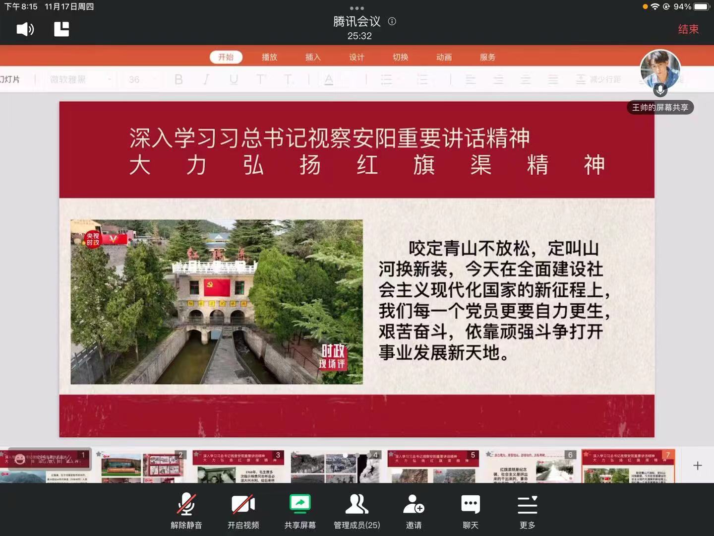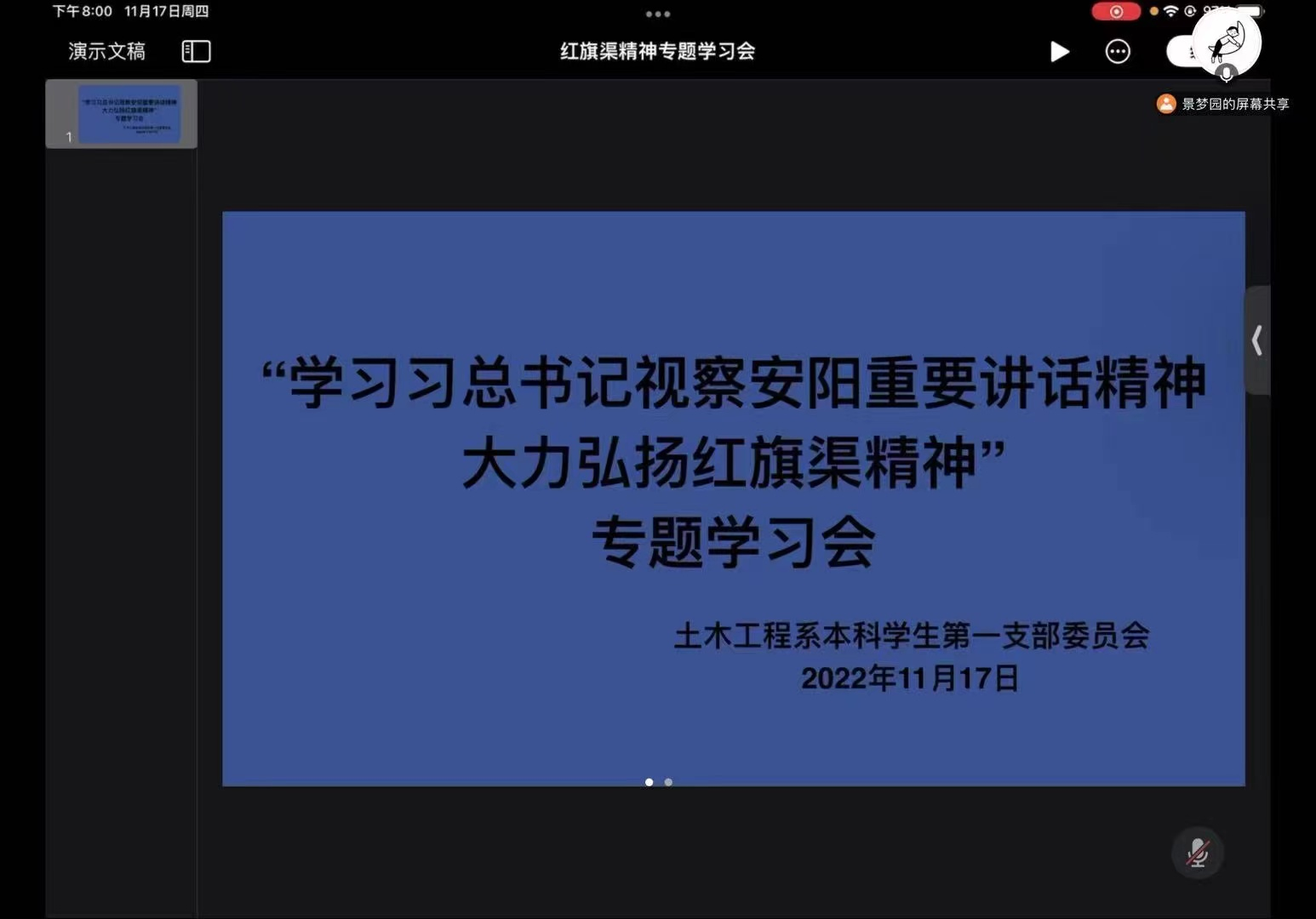 11月17日,草榴社区 土木工程系本科第一学生党支部组织召开“习近平总书记视察安阳重要讲话精神,大力弘扬红旗渠精神”线上专题学习会,会议由支部书记景梦园主持,支部全体党员参会。