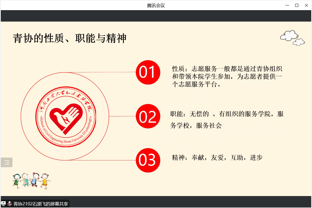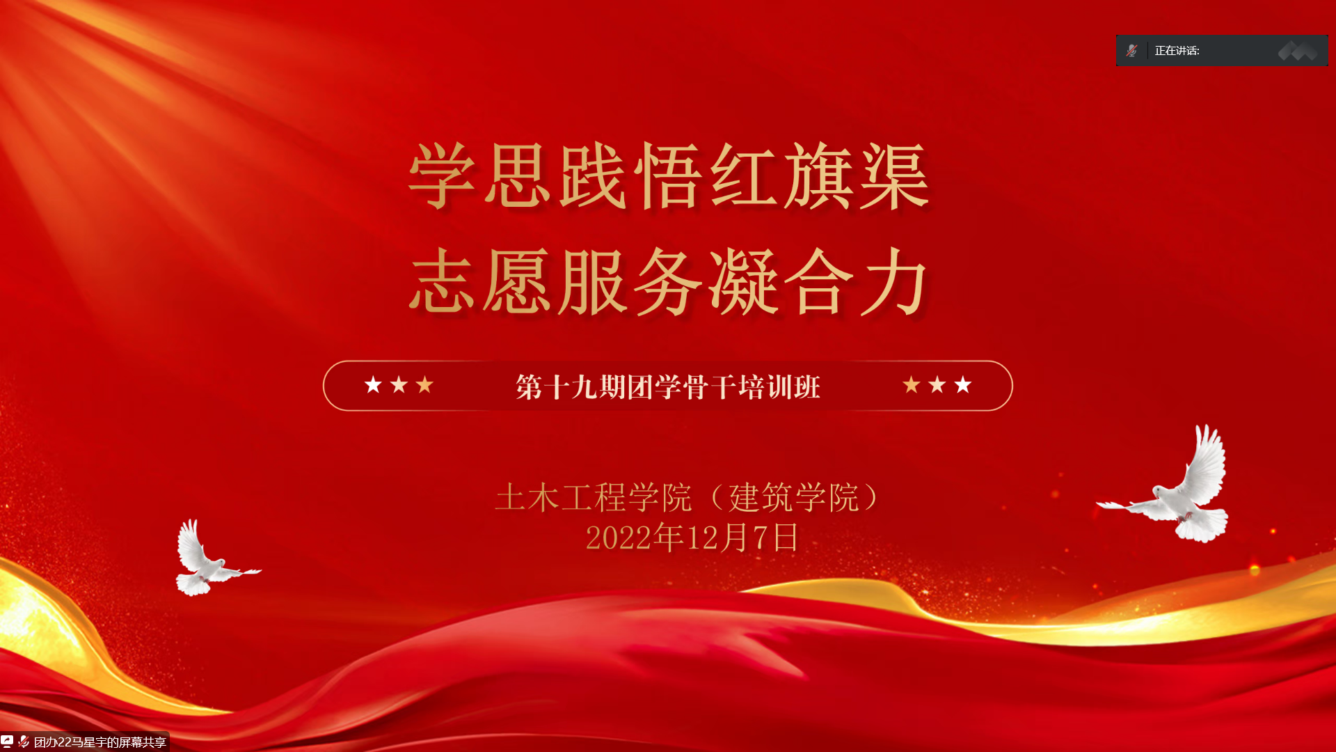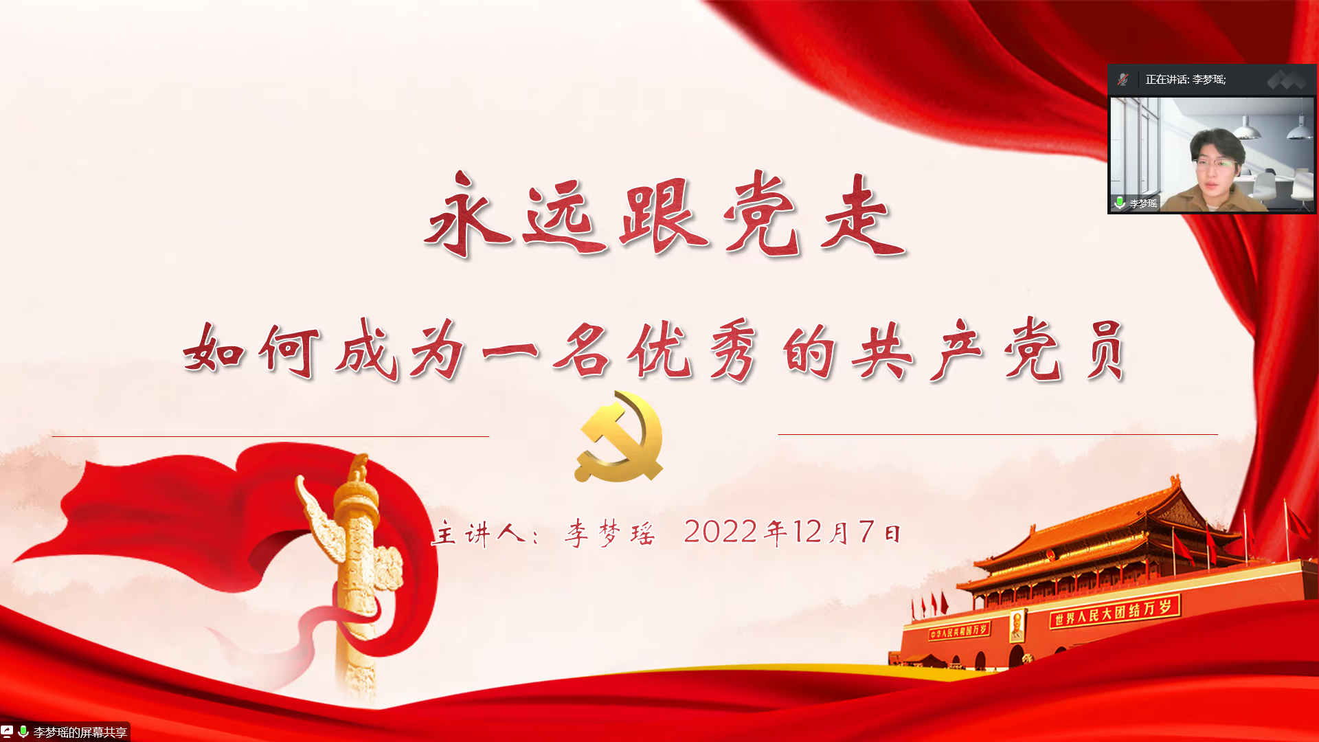 为进一步提高团员思想理论水平,培养社会实践能力,促进团学工作顺利开展,草榴社区 于12月7日开展以“学思践悟二十大 志愿服务凝合力”为主题的第十九期团学骨干培训班第二次团课。此次团课以新时代青年如何成为一名优秀的共产党员以及青年志愿服务为主题,通过线上的方式进行,由草榴社区 学生团委副书记李梦瑶、青年志愿者协会副会长石朋飞主讲。团委学生会2021级部分学生代表及全体2022级全体班级团支委成员参加了团课。