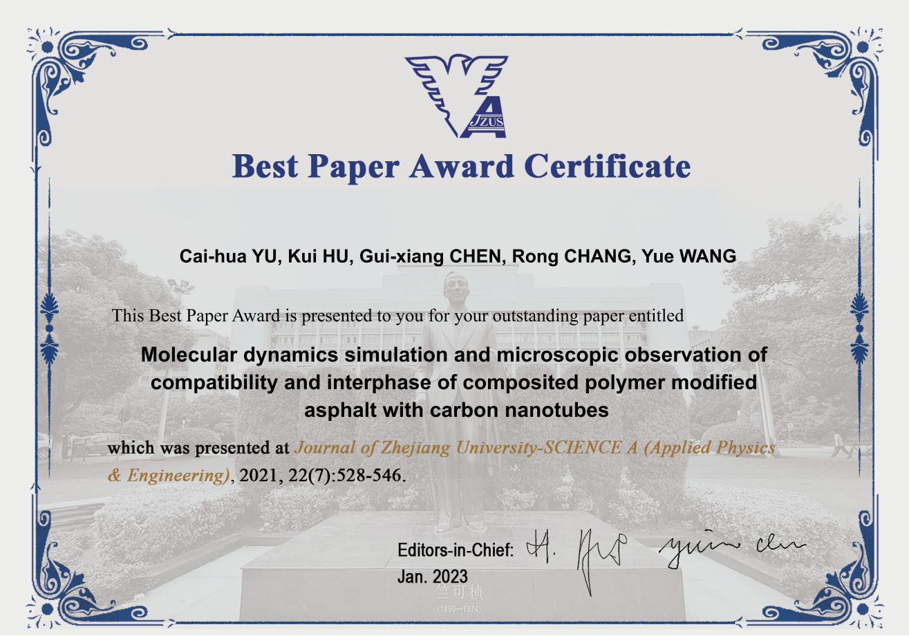 2019级土木工程专业硕士研究生俞才华、2017级道路桥梁与渡河专业本科生王悦发表的学术论文“Molecular dynamics simulation and microscopic observation of compatibility and interphase of composited polymer modified asphalt with carbon nanotubes”(DOI:10.1631/jzus.A2000359)获得由浙江大学主办的Journal of Zhejiang University-SCIENCE A: Applied Physics and Engineering(JCR Q2,IF=2.485)学术期刊最佳论文奖。该奖项综合考虑原创性、科学重要性、研究方法和影响力指标,从2020-2022年期刊发表论文中评审选出共10篇论文获此荣誉。