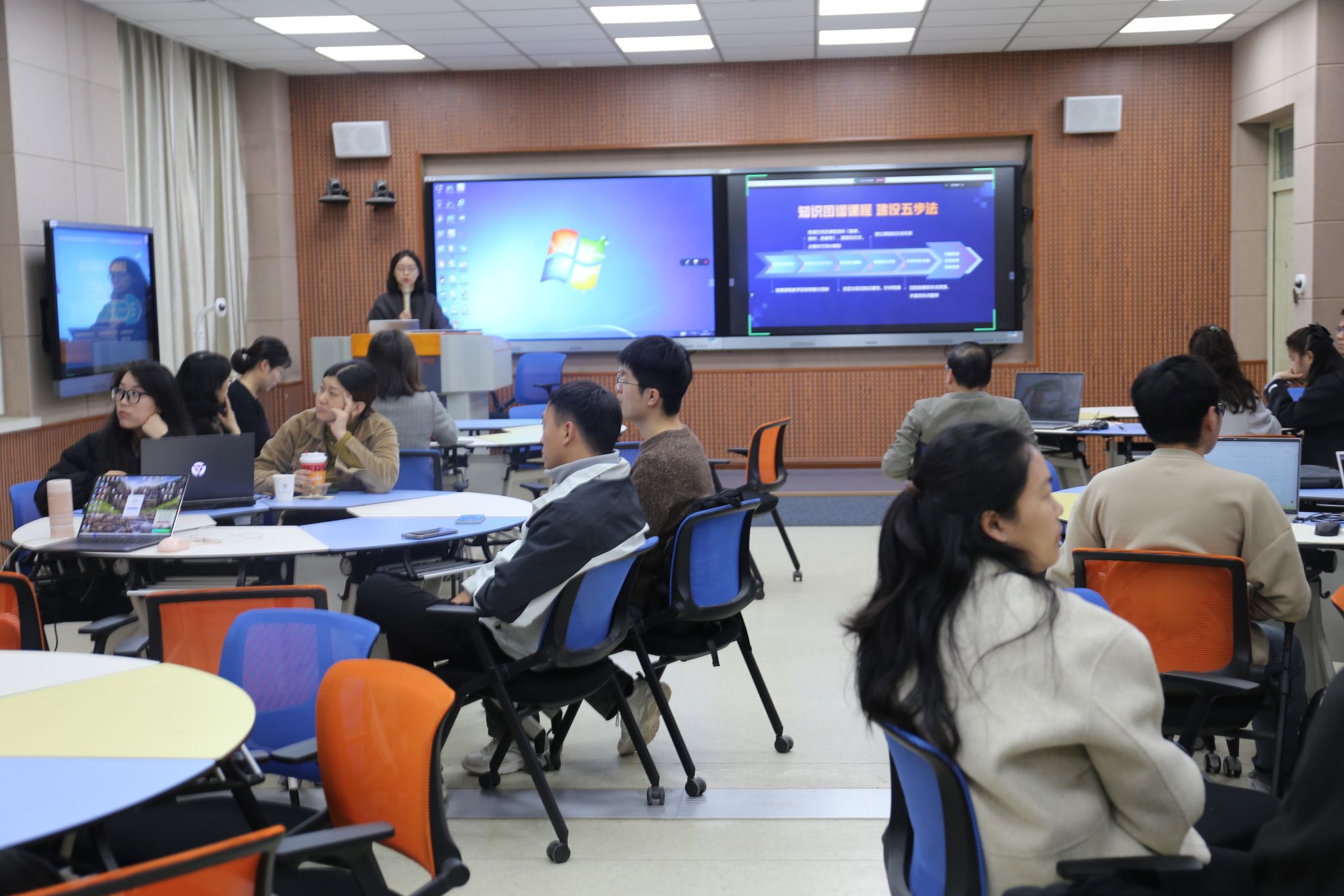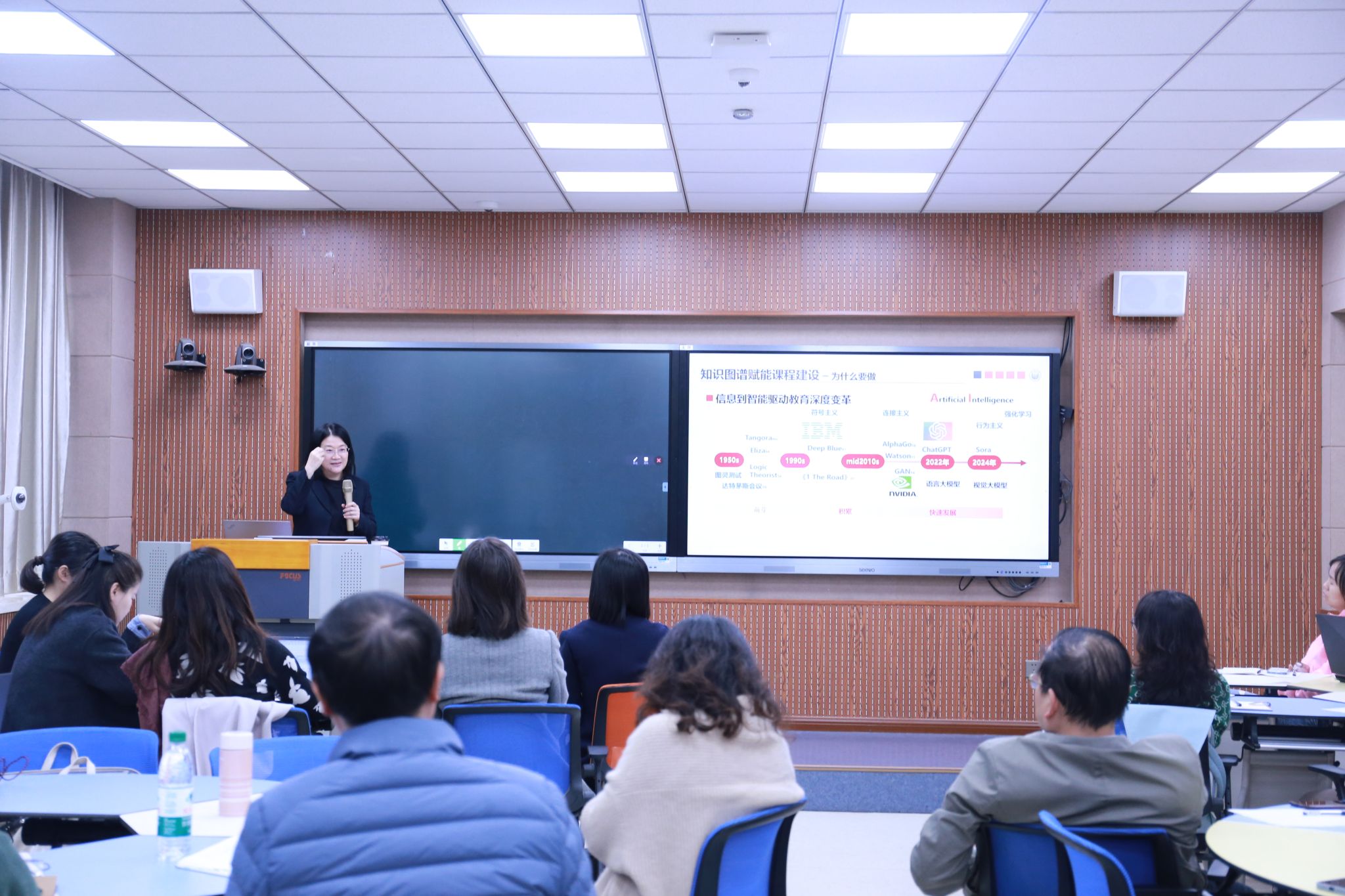 下午,秦浩光则带来了题为“构建智慧教育新生态——知识图谱与AI驱动下的智慧课程开发”的主题演讲。她详细阐述了智慧课堂平台对于数字化教学环境的重要性,介绍了如何拆解知识点、建立知识点之间的关系网络、设置问题解决路径等关键步骤,并强调了知识图谱在推动学科专业发展中的重要作用。为教师们呈现了生动形象的智慧教学场景,带领教师们进行了知识图谱构建的实操。