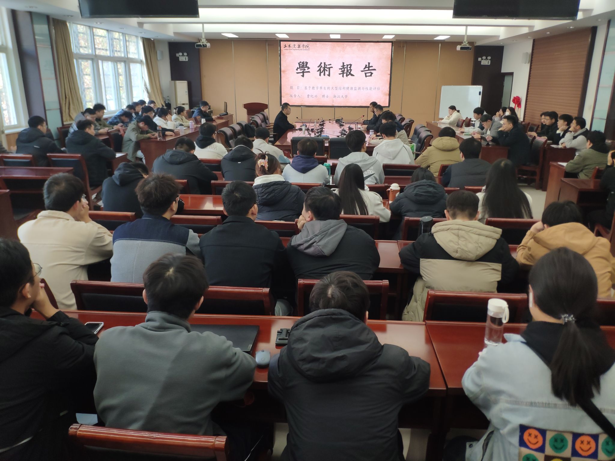 师生做了题为《基于数字孪生的大型结构健康监测与性能评估》的学术报告。报告会由副院长静行教授主持,副院长黄海荣教授、基建处副处长张庆章教授及青年教师和研究生、本科生代表共同聆听了报告会。