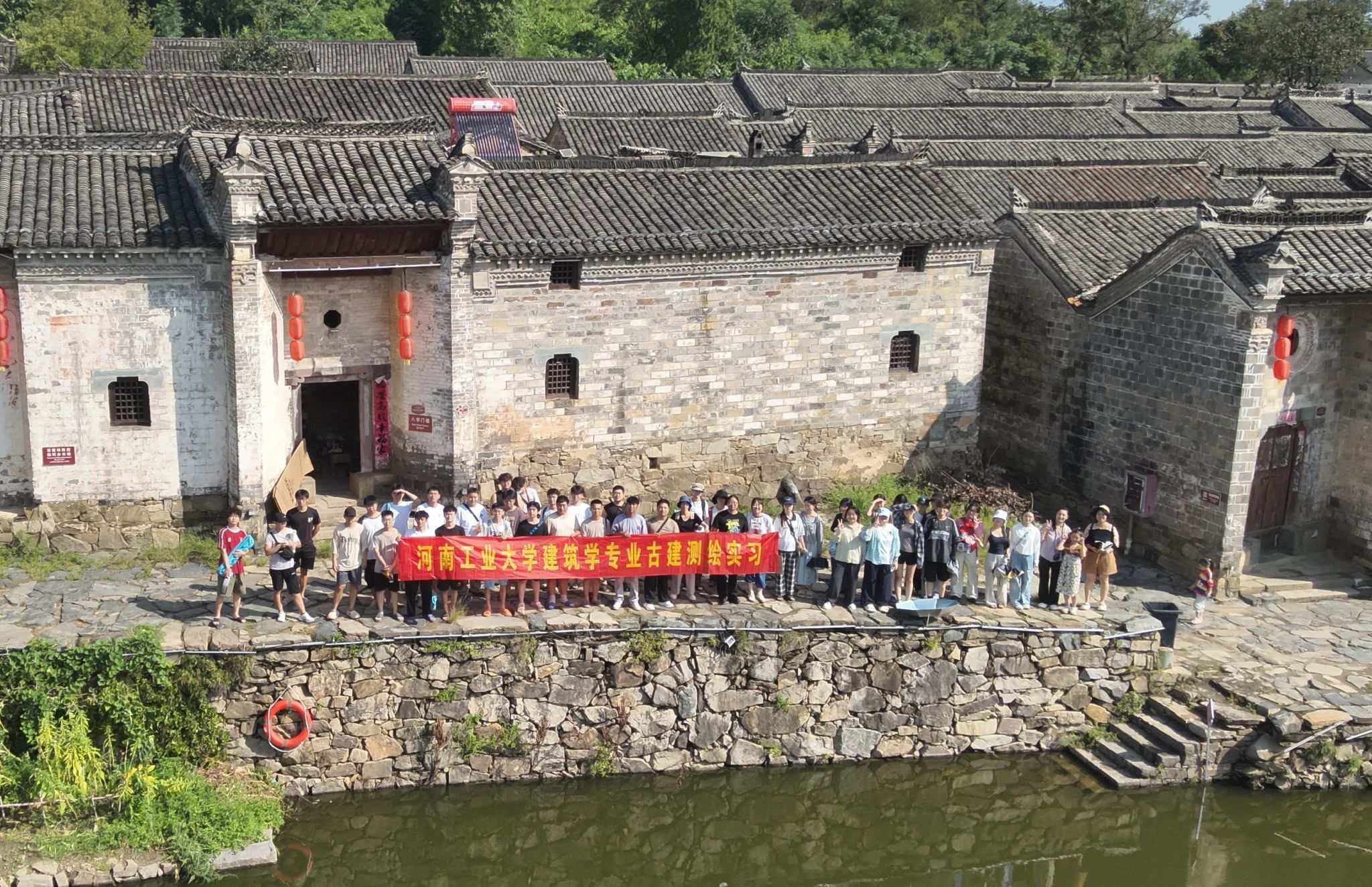 8月25日,师生们抵达首站——信阳市新县丁李湾村。该村地处皖、豫、鄂三省交界,建筑风格融汇南北,现存明清时期传统建筑三百余间。学生分组开展调研,收集村落沿革与口述历史资料,运用无人机进行全景航拍与建筑细部测绘,并对保存较为完好的门楼及民居进行精细测量与图纸绘制。