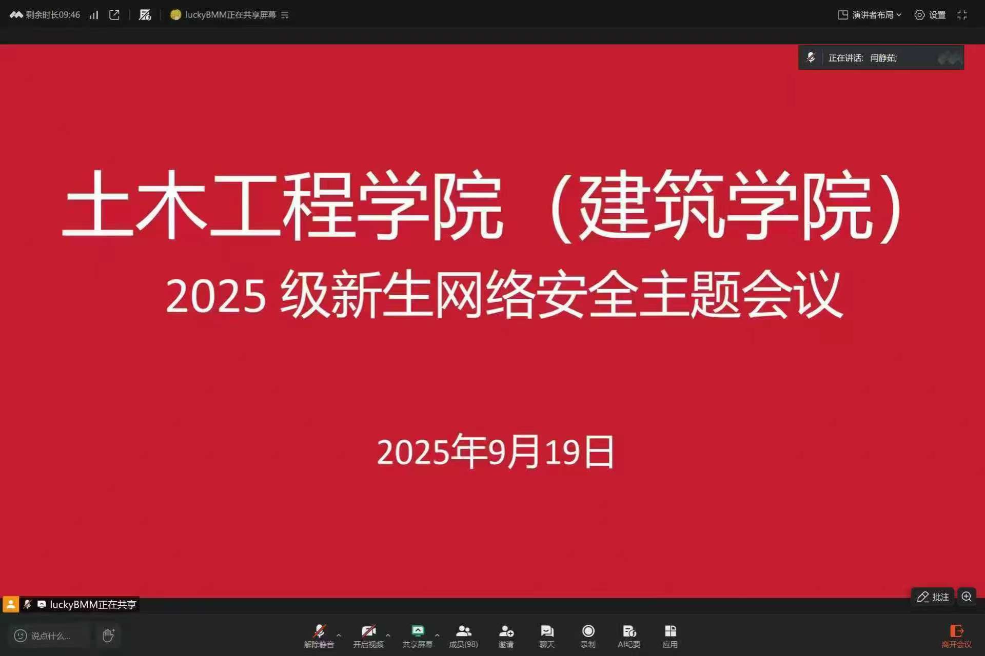 为帮助 2025 级新生快速适应大学生活、树立网络安全意识与集体荣誉感,9 月 19 日,草榴社区 在腾讯会议组织召开 2025 级新生网络安全主题会议暨新生工作会议。学院党委副书记杨阳、团委书记闫静茹、辅导员吴霞以及全体2025级新生参加会议。