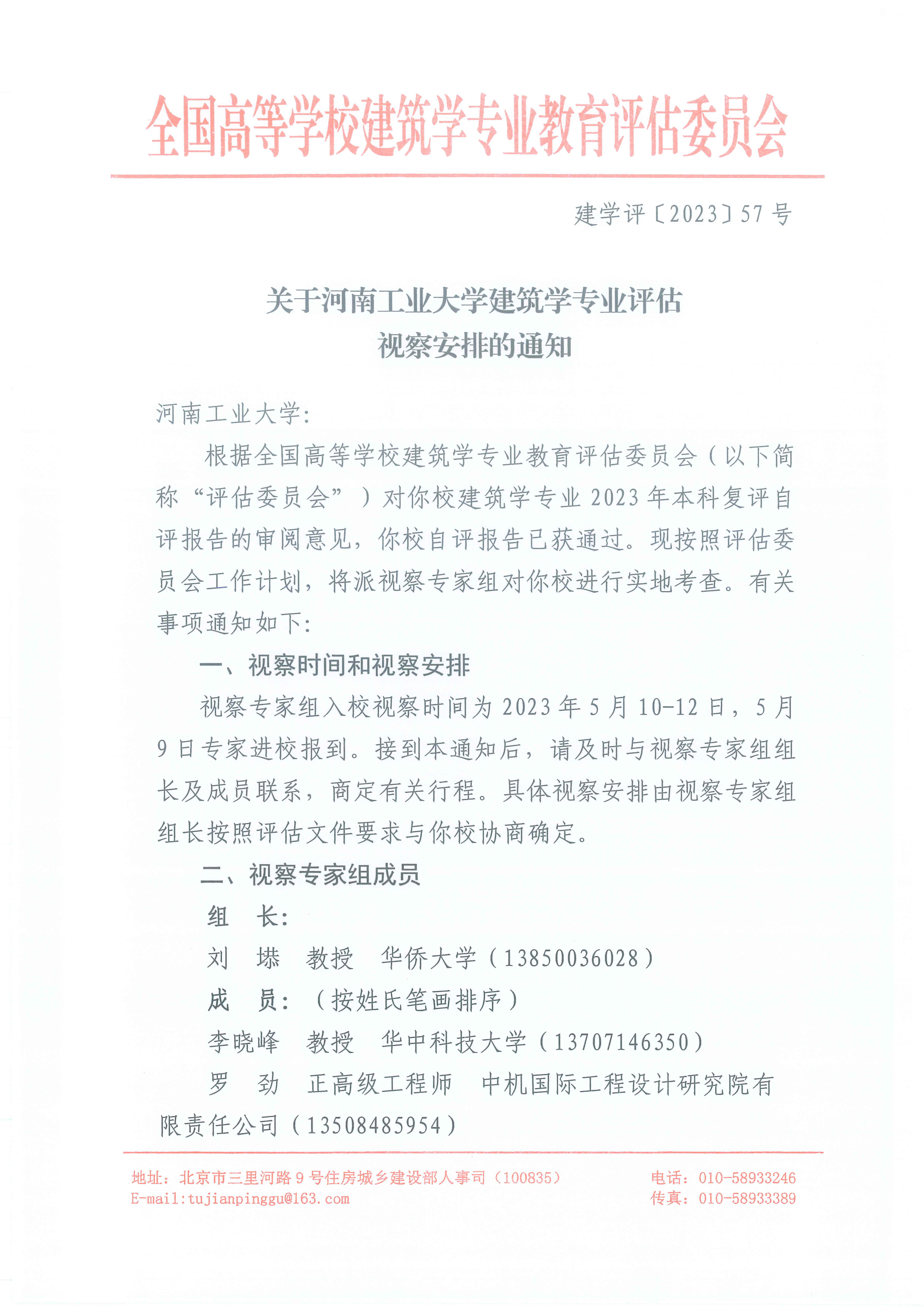 关于河南工业大学建筑学专业评估视察安排的通知